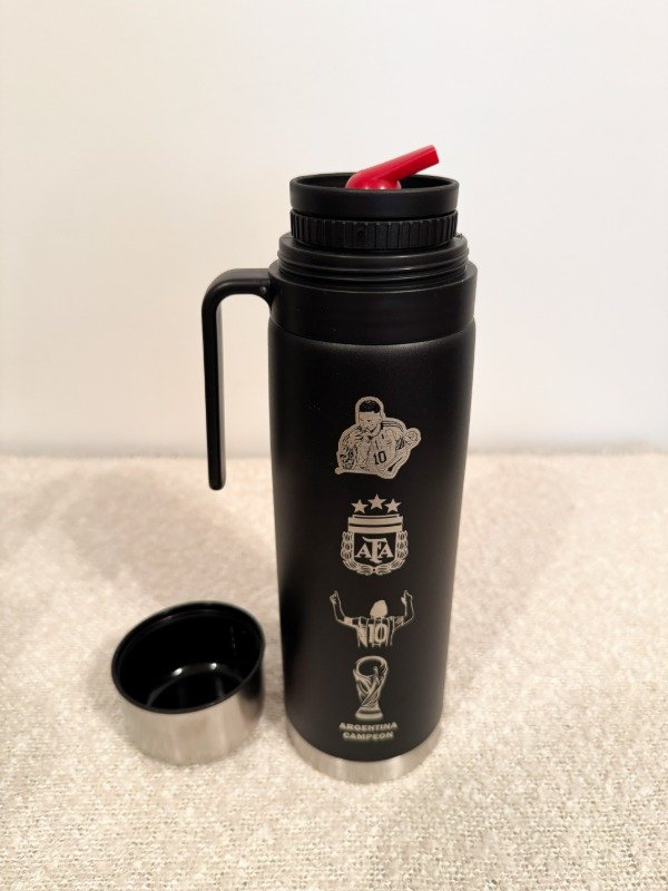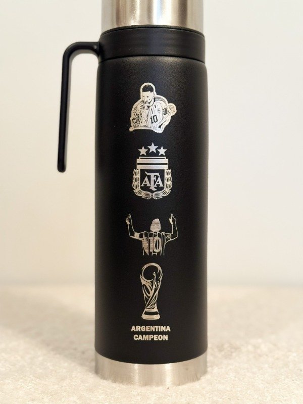 Termo de 1L de acero inoxidable con media manija y pico cebador con diseño exclusivo grabado de Messi.